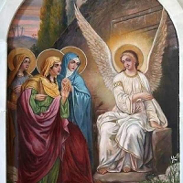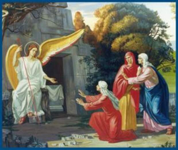 В первый день недели святые жены-мироносицы, купив ароматы, пришли рано ко гробу, чтобы помазать тело Иисусово, но увидели камень отваленным от гроба и ангела, который возвестил им, что Иисус воскрес. Господь явился Марии Магдалине, из которой изгнал семь бесов, и просил сказать апостолам, чтобы ожидали Его в Галилее.
