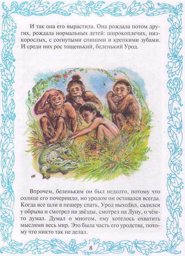 Впрочем, беленький он был недолго, потому что солнце его почернило, но уродом он оставался всегда. Когда все шли в пещеру спать, Урод выходил, садился у обрыва и смотрел на звезды, смотрел на луну, о чем-то думал. Думал о многом, ему хотелось охватить мыслями весь мир. Это была часть его уродства, потому что никто так не делал.