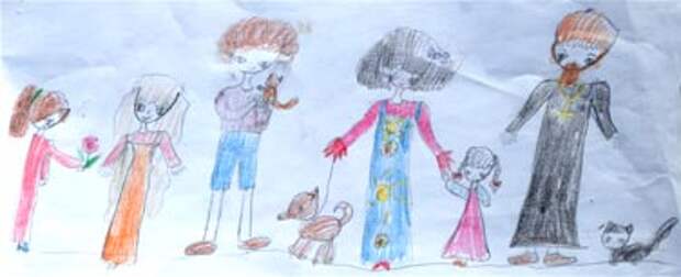 А Мариша у нас очень любит рисовать. Рисунки у неё очень осмысленные, не пустые. Вот лиса бежит, а глаз на спине. «Почему?» – спрашиваю. «Ей так удобнее видеть», – отвечает. В первом классе насмешила нас одним своим рисунком. Нарисовала всю нашу семью, кроме Серёжи. «Мариш, – обращаюсь к ней, – ты что, не любишь его?» А Мариша так застенчиво отвечает: «Не знаю, как его кудрявые волосы нарисовать».