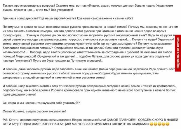 «Почему мы не давим танками всех этнических русских проживающих на нашей земле? Почему мы, наконец-то, не начнем их всех сжигать в газовых камерах, как это делали сами русские при Сталине в отношении наших дедов во время голодомора?.... Почему в Украине до сих пор полностью не запретили русский оккупационный язык? Ведь та же русня в своей рашке все народы заставила говорить по-русски, уничтожив все местные языки!..... Почему на нашей Украинской земле, измученной русскими оккупантами, русские чувствуют себя как на турецком курорте? Почему им оказывается бесплатная медицинская помощь? Юридическая помощь, и так далее? Если эти русские ненавидят Украинскую независимость!..... Вообще, надо ввести уголовную ответственность за сострадание к русским! За оказание им любой помощи! Медицинской! Юридической и так далее!.... подобно Латвии, для русских давно уж пора сделать отдельный паспорт «оккупанта»! Пусть им будет стыдно за Путинскую агрессию!..